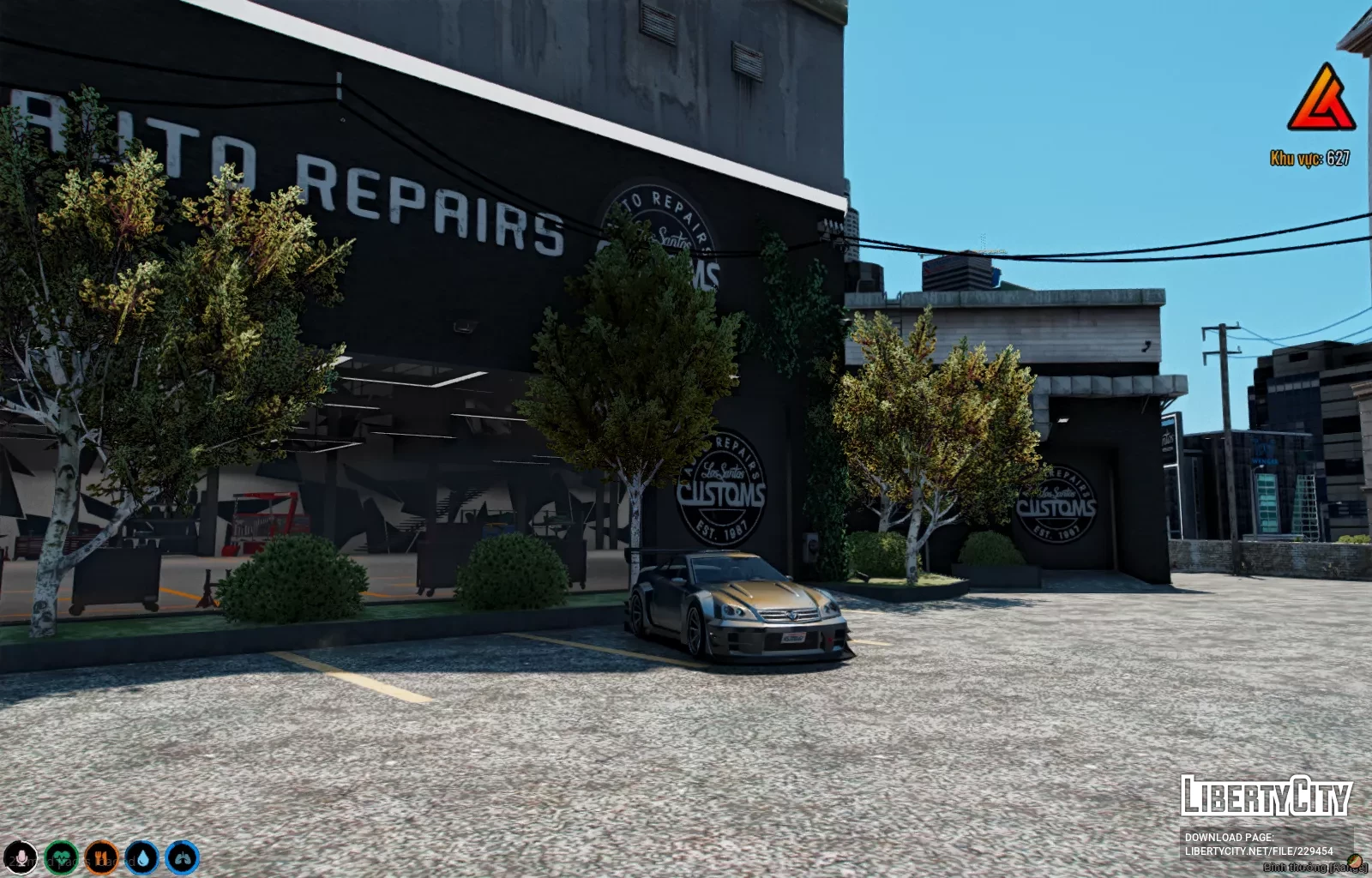 Burton LSC — это автомастерская, расположенная в современном здании с тёмным фасадом. На стенах мастерской видны большие логотипы Los Santos Customs. Перед входом находится просторная асфальтированная парковка с разметкой для автомобилей. Здание окружено зелёными насаждениями: по периметру высажены деревья и кустарники, а часть фасада украшена вьющимися растениями. Вход в мастерскую выделен большими воротами и надписью "AUTO REPAIRS". В целом, место выглядит ухоженным и современным, с акцентом на зелёные элементы и чистоту территории.