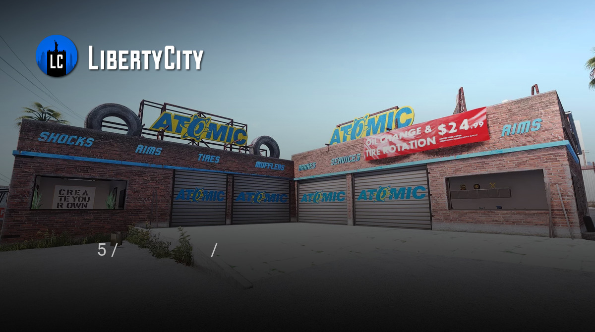 Автомастерская Atomic Mechanic представляет собой кирпичное здание с несколькими гаражными воротами, окрашенными в серый цвет и украшенными ярко-голубыми надписями "ATOMIC". На крыше установлены массивные вывески с логотипом Atomic в жёлто-голубых тонах и декоративные автомобильные шины. По фасаду здания размещены надписи с перечнем предоставляемых услуг: "SHOCKS", "RIMS", "TIRES", "MUFFLERS", "SERVICE", "TRACTION". Справа висит крупный красный баннер с рекламой замены масла и шиномонтажа. Перед зданием — просторная чистая площадка, окружённая низкой растительностью и пальмами. Атмосфера типична для калифорнийских автомастерских: ярко, чисто и современно.