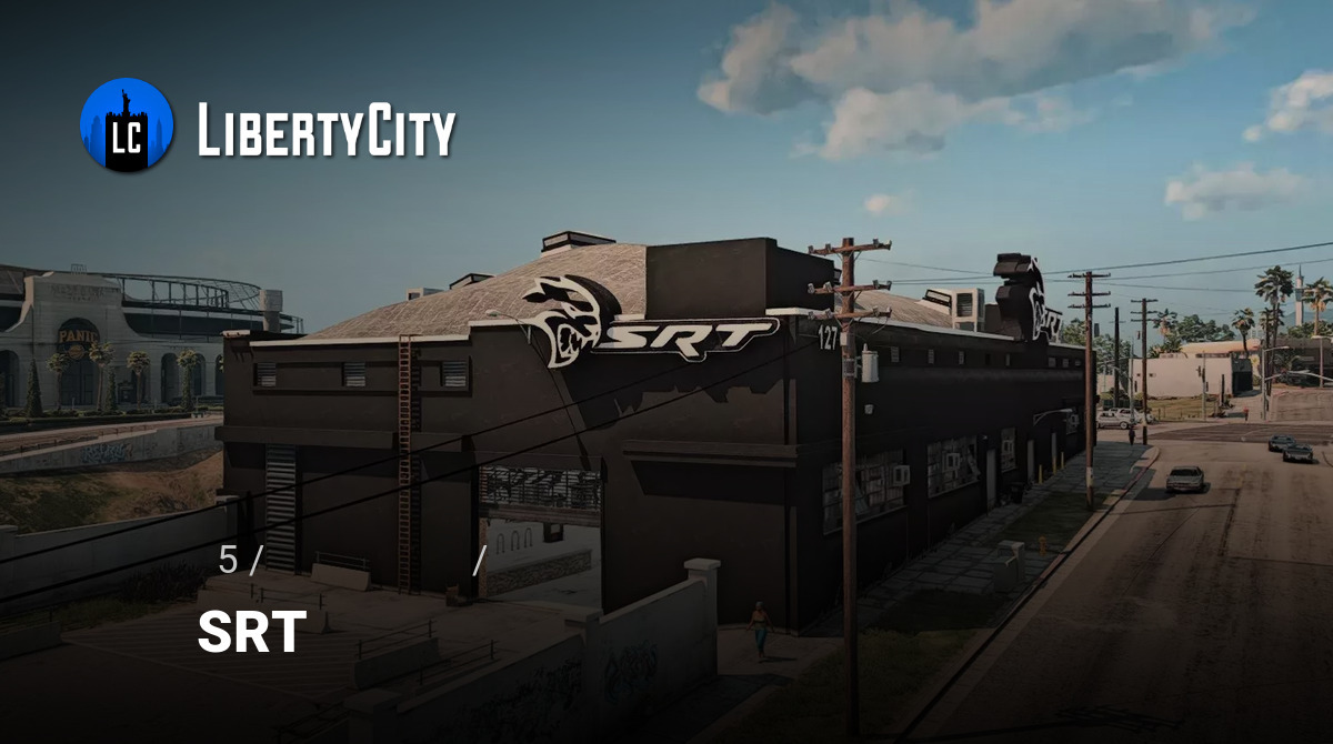 Здание автомастерской SRT выполнено в современном индустриальном стиле. Его фасад окрашен в глубокий чёрный цвет, что придаёт сооружению строгий и стильный вид. На крыше и боковой стене крупно размещён логотип SRT с изображением головы хищника и белыми буквами, что сразу выделяет мастерскую среди окружающих построек. На стенах присутствуют небольшие окна и вентиляционные решётки, а также пожарные лестницы. Входная зона оборудована просторными воротами для заезда автомобилей, а рядом располагается небольшая парковка с граффити на бетонном заборе. Здание находится на углу улицы, что обеспечивает удобный подъезд с двух сторон.