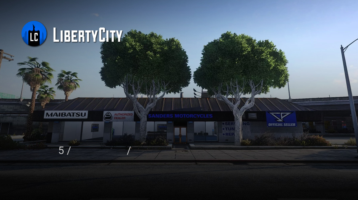 Здание Sanders Motorcycles представляет собой одноэтажное строение с плоской крышей и современным фасадом. На передней части здания расположены большие витринные окна, через которые виден интерьер салона. По центру фасада размещена яркая синяя вывеска с надписью "SANDERS MOTORCYCLES". Слева от входа находится вывеска "MAIBATSU" и значок авторизованного дилера, а справа — баннер "OFFICIAL SELLER" с логотипом. Перед зданием растут три крупных дерева с густой кроной, а по бокам высажены декоративные кусты и растения. Тротуар перед магазином широкий и чистый, рядом установлены уличные фонари. В целом, внешний вид здания современный и ухоженный, с акцентом на мотоциклетную тематику.