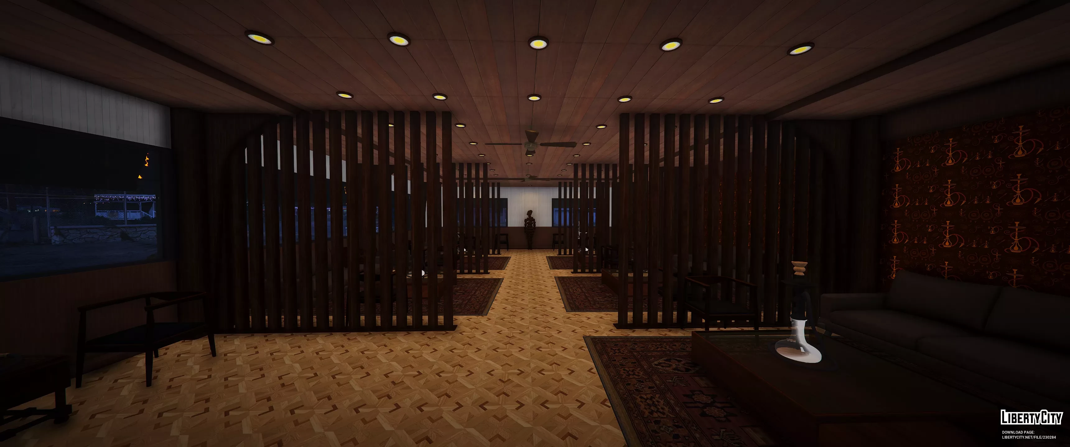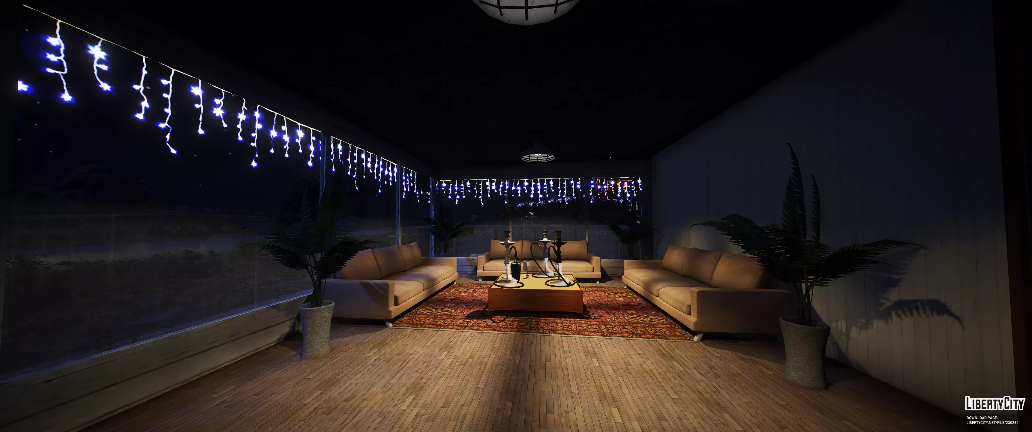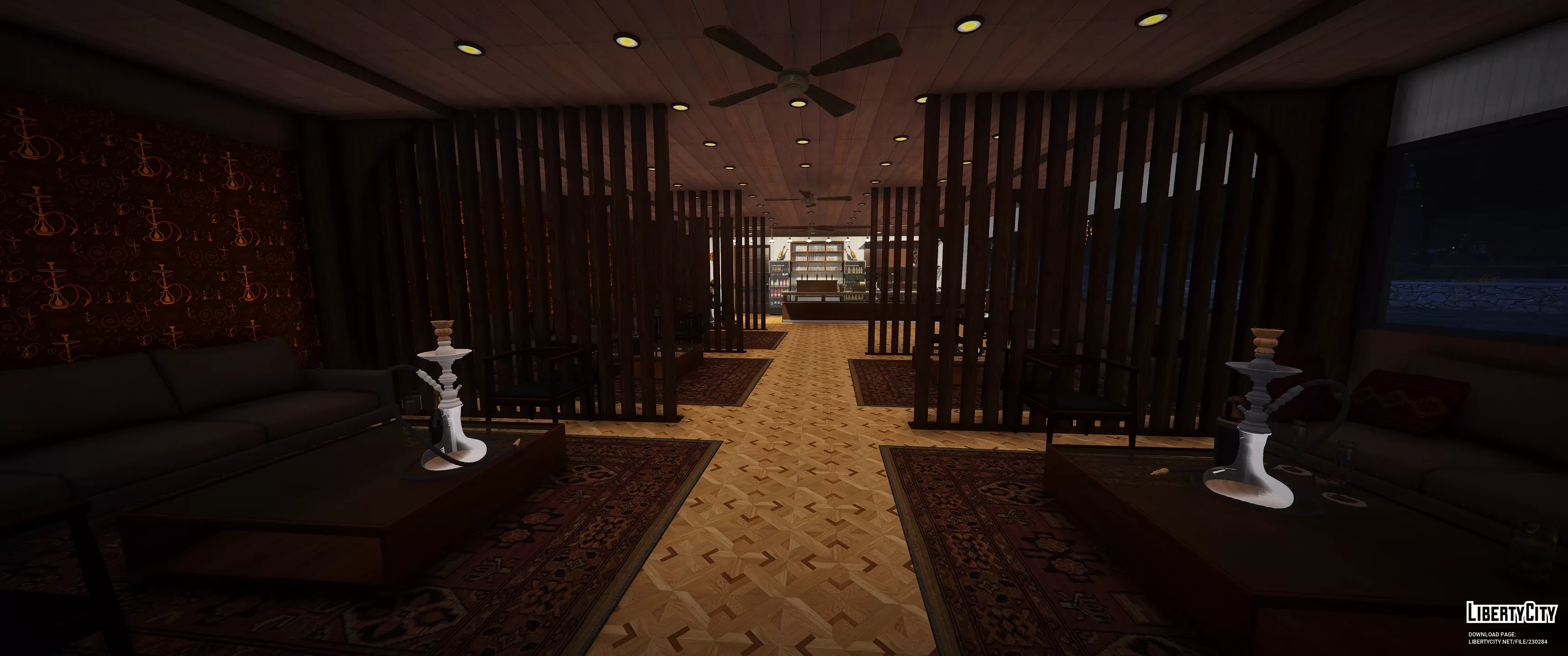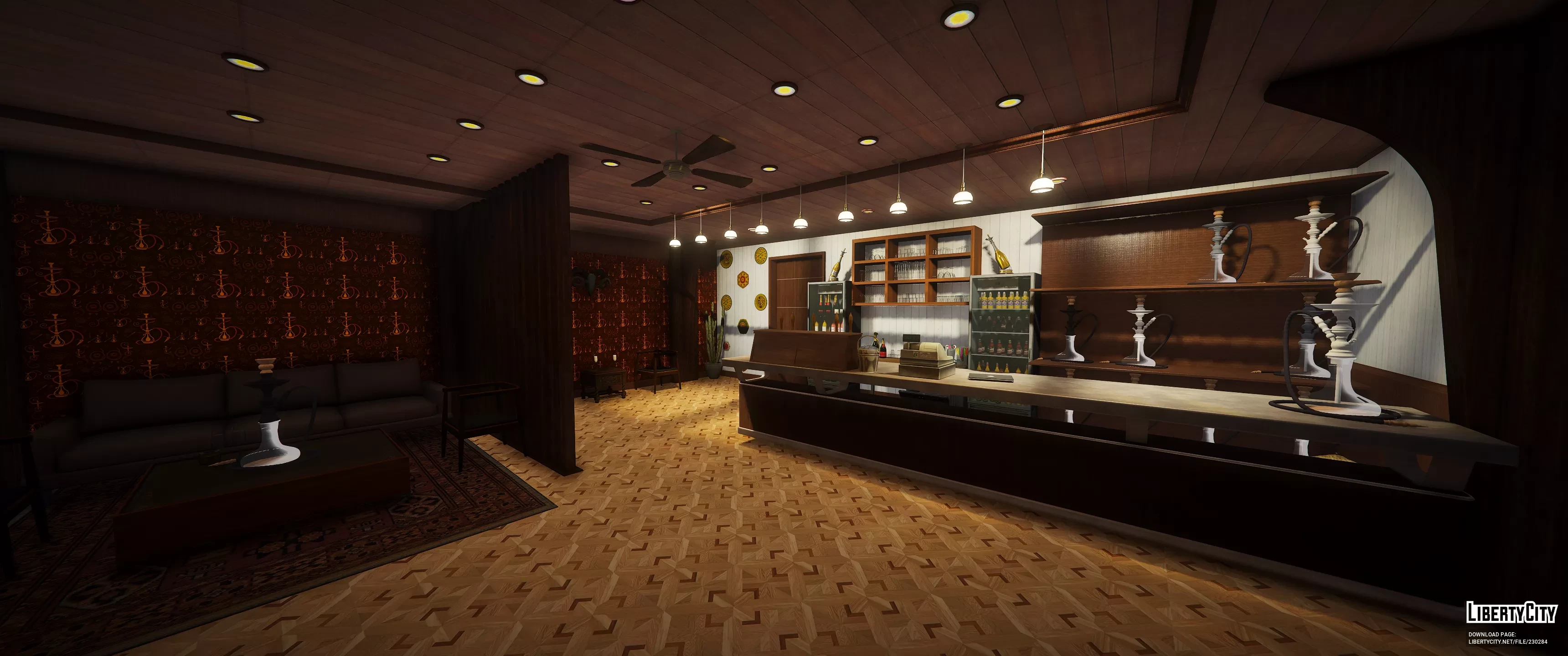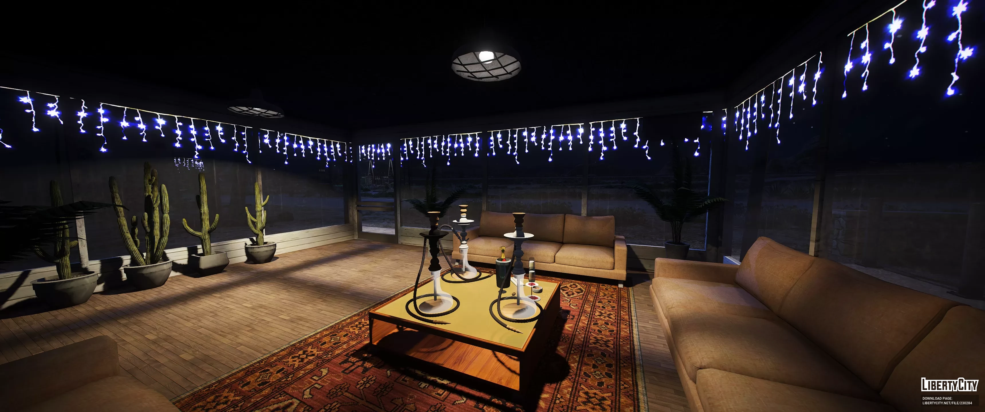 المبنى يقع في ضاحية صحراوية، يبرز بين المناظر المحيطة. إنه مبنى من طابق واحد، بسقف طويل مزين بسلاسل من الأضواء الصفراء الدافئة والزرقاء الباردة، مما يخلق جوًا مريحًا في الليل. باب المدخل أحمر زاهي، وبجانبه تضيء لافتة المؤسسة. أمام البار يوجد موقف سيارات صغير، وحول المبنى تنمو أشجار النخيل العالية. بشكل عام، يبدو المكان مرحبًا وأنيقًا، خاصة بفضل الإضاءة الاحتفالية في خلفية السماء المرصعة بالنجوم.