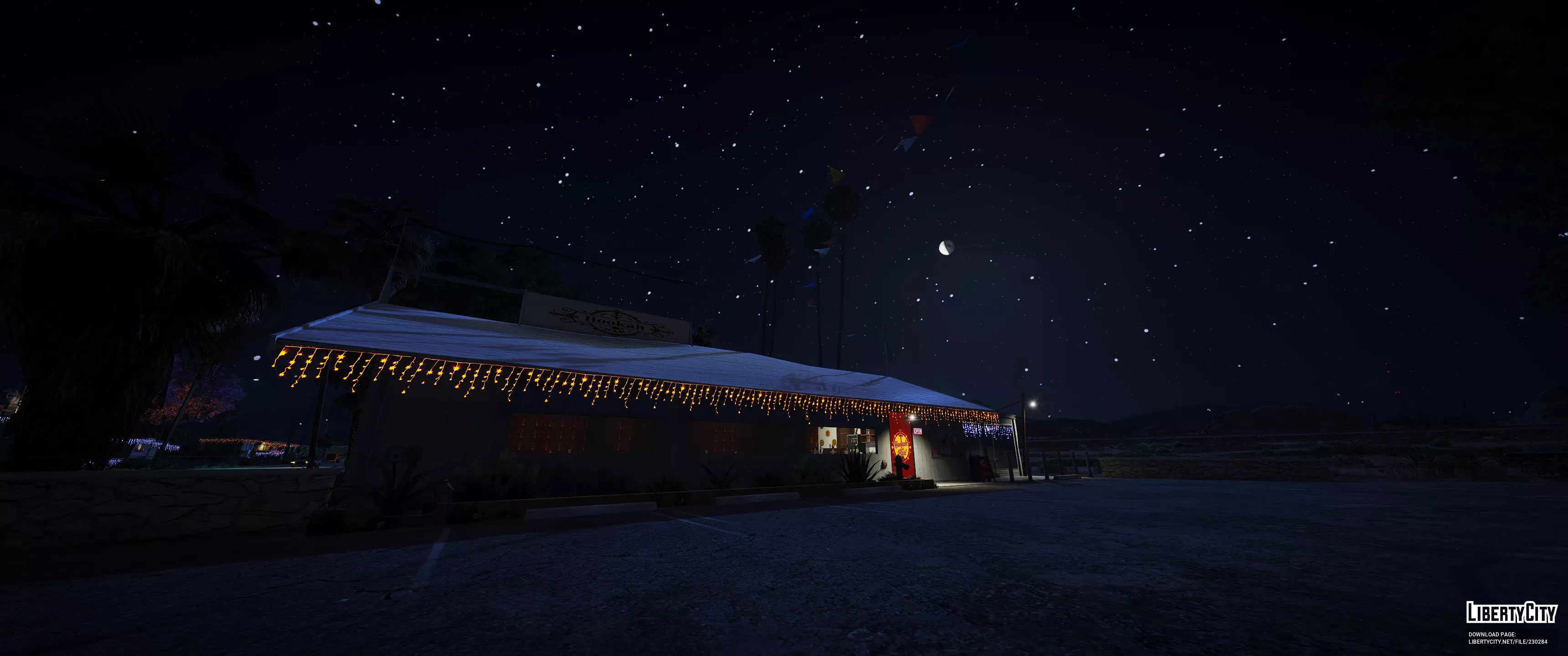 Здание расположено на пустынной окраине, выделяется среди окружающего ландшафта. Оно одноэтажное, с длинной крышей, украшенной гирляндами из теплых желтых и холодных синих огней, что создает уютную атмосферу ночью. Входная дверь ярко-красная, рядом с ней светится вывеска заведения. Перед баром небольшая парковка, а вокруг здания растут высокие пальмы. В целом, заведение выглядит гостеприимно и стильно, особенно благодаря праздничной иллюминации на фоне звездного неба.