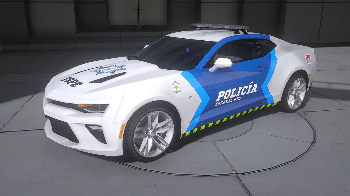 2016 شيفروليه كامارو شرطة ولاية غواناخواتو مكسيك لـ GTA 5. الجزء الأمامي: غطاء المحرك مزين بشعار كبير لشرطة ولاية غواناخواتو وعبارة "FSPE"، مما يبرز الغرض الوظيفي للسيارة. شبكة المبرد الضيقة ذات التصميم المميز مع تشطيب أسود وشعار شيفرو...