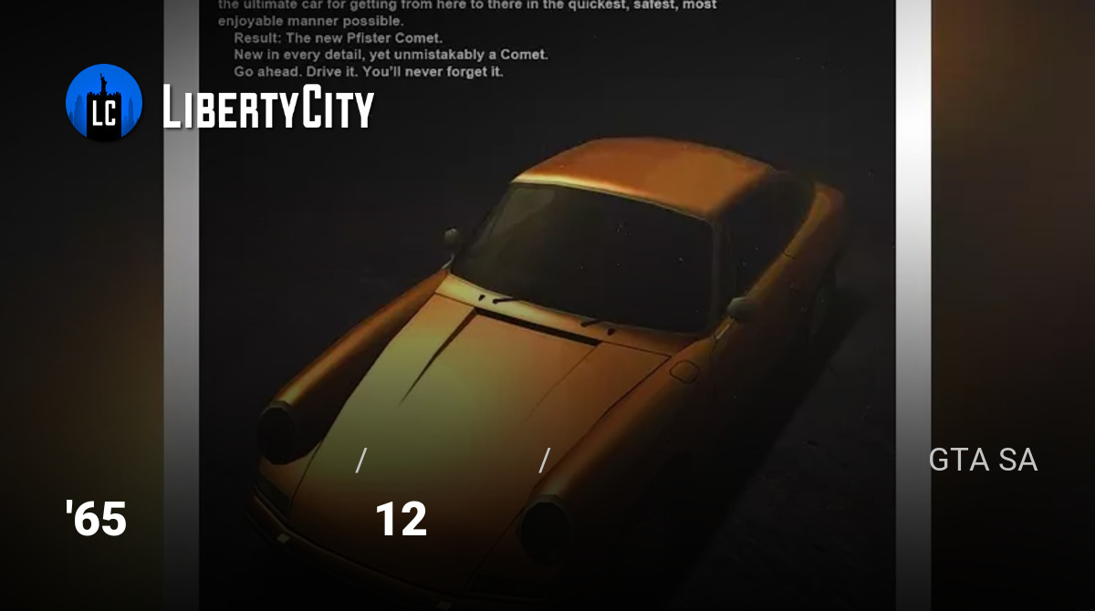 Это lore-friendly автомобиль, выполненный в оригинальном стиле игры. Модель вдохновлена легендарным Porsche 912 (1965 года) и представляет собой классический спортивный купе, идеально сочетающийся с эстетикой Сан-Андреаса. Машина детализирована, имеет качественные текстуры и полностью соответствует каноничному стилю транспорта GTA San Andreas.