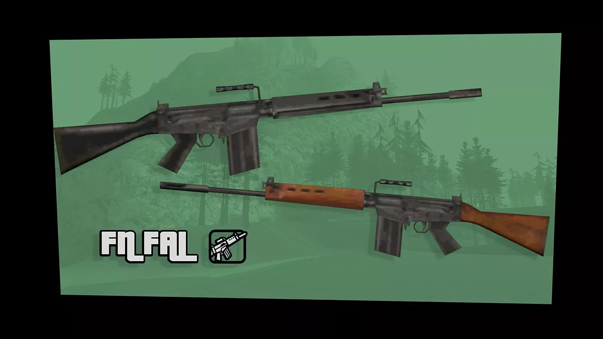 FN FAL لـ GTA San Andreas. المؤلف: Rancor12; الملمس: Millenia; التحويل إلى اللعبة: EmiKiller. يستبدل m4. يمكن استبداله بـ cuntgun أو ak47، فقط عن طريق تغيير اسم ملف dff واستبدال ملف txd من مجلد "Txd". جودة ممتازة للنموذج والملمس. هناك لمعان خفيف....